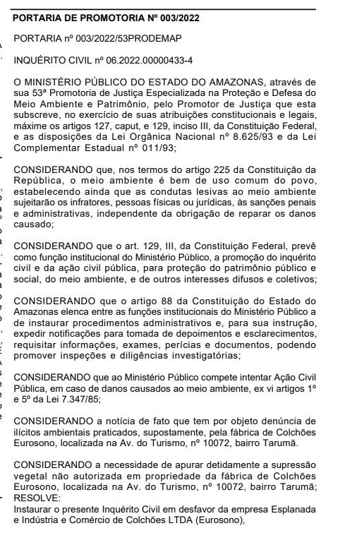O promotor de Justiça Carlos Sérgio Edwards de Freitas, resolveu considerar a necessidade de apurar a supressão vegetal não autorizada em propriedade da fábrica de colchões Eurosono, localizada na avenida do Turismo nº 10072, bairro Tarumã, Zona Oeste.