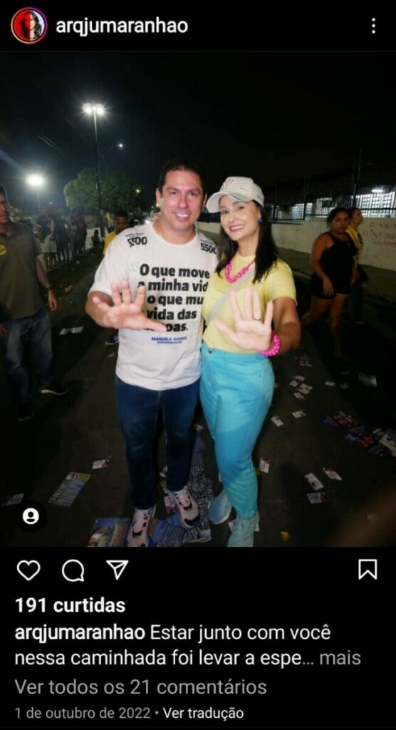 Nas redes sociais, a última postagem de Ju Maranhão ao lado de Marcelo Ramos é do dia 1 de outubro, um dia antes da divulgação do resultado das eleições que não reelegeram Ramos.