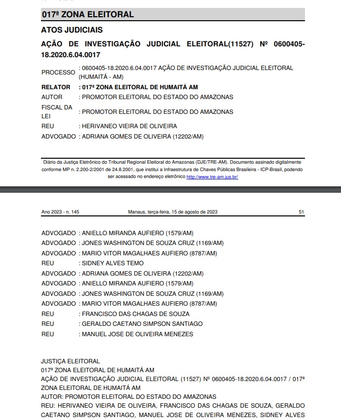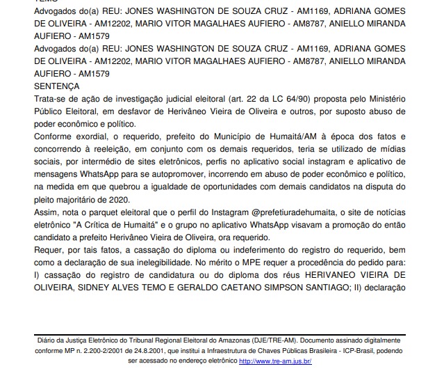 Amazonas – No último dia 15, o Tribunal Regional Eleitoral do Amazonas (TRE-AM) decidiu tornar inelegível por um período de oito anos o ex-prefeito de Humaitá, Herivaneo Vieira de Oliveira, juntamente com outros indivíduos ligados à promoção de sua candidatura. A medida também afeta Geraldo Caetano Simpson Santiago, ex-candidato a vereador, e Manoel José de Oliveira Menezes, servidor público municipal e editor.
