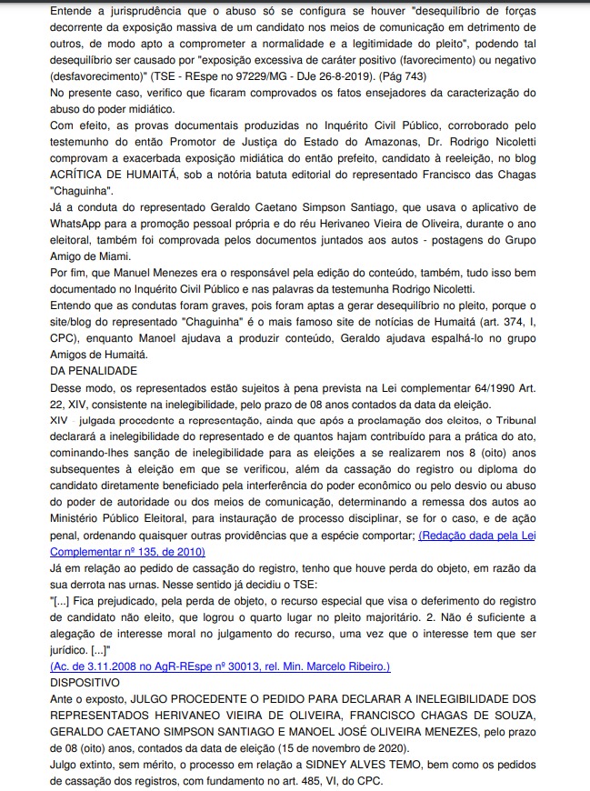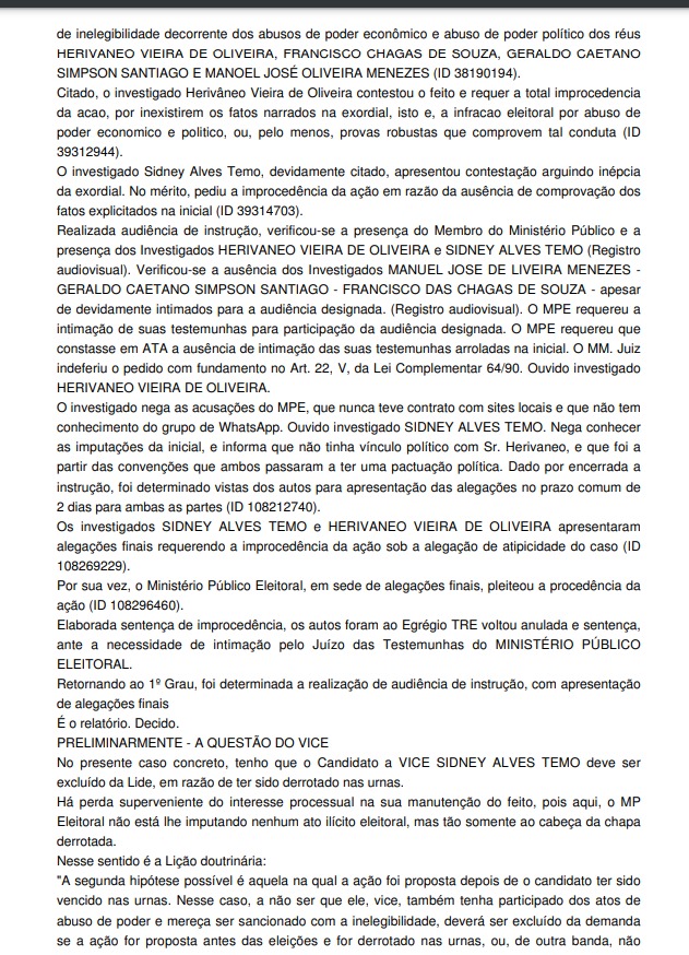 De acordo com o processo, as redes oficiais da Prefeitura foram utilizadas para uma exposição excessiva do candidato Herivaneo Vieira. Francisco das Chagas de Souza, conhecido como Chaguinha, foi apontado como responsável pela orientação de criar também um editorial em um site bastante popular no município para promover o prefeito.