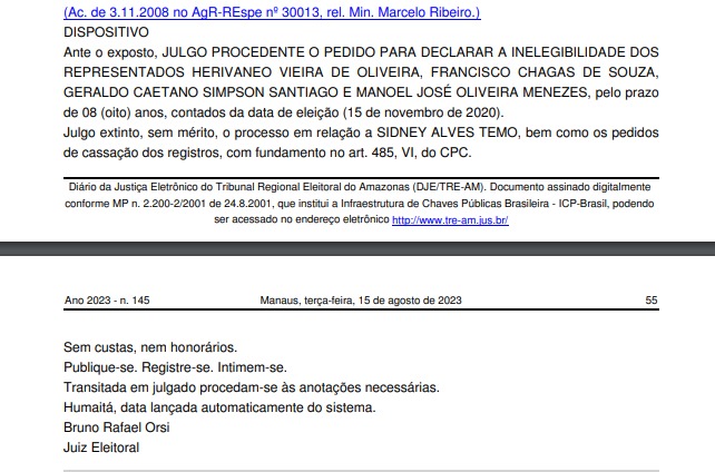 A determinação judicial baseia-se na Ação de Investigação Judicial Eleitoral (11527) nº 0600405-18.2020.6.04.0017 e foi publicada na edição do dia 15 deste mês no diário oficial da Justiça Eleitoral. Segundo o TRE-AM, o prazo de inelegibilidade tem início a partir das eleições gerais municipais de 15 de novembro de 2020.