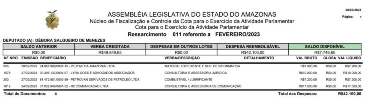 Do total de R$ 49.849,65, a deputada novata Débora Menezes (PL) utilizou o valor total de R$42.100,00 para pagar despesas, incluindo a empresa de comunicação, e sobrou apenas R$7.749,65. O que sobra acumula para o mês seguinte. Essas informações foram retiradas do Portal da Transparência.