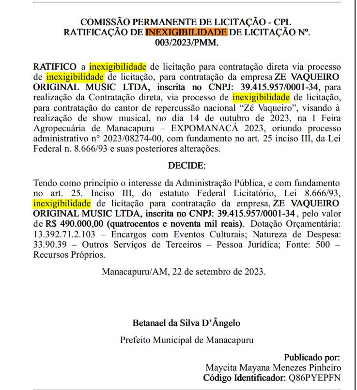 Amazonas – O prefeito Beto D’Ângelo vai tirar R$ 490 mil dos cofres públicos para bancar o show do cantor Zé Vaqueiro em Manacapuru. O artista será atração nacional na I Feira Agropecuária do município e a Ratificação de Inexigibilidade de Licitação nº 003/2023 foi assinado e publicado nesta terça-feira (26) no Diário Oficial da Associação Amazonense de Municípios (AAM).