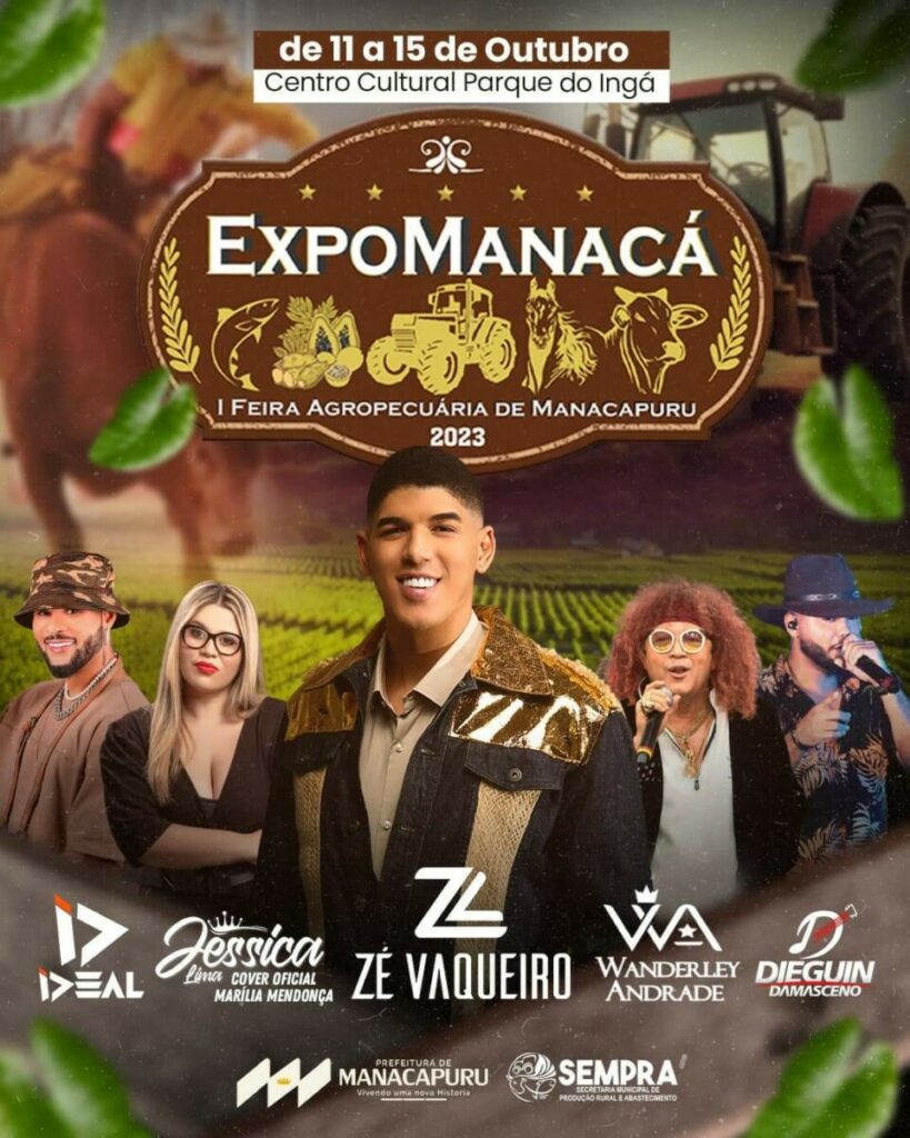 A I Feira Agropecuária de Manacapuru (ExpoManacá) vai acontecer entre os dias 11 e 15 de outubro no Centro Cultural Parque do Ingá. Além de Zé Vaqueiro, as atrações Wanderley Andrade, Dieguin Damasceno, Deal e o cover da Marília Mendonça, a cantora Jéssica Lima. A Prefeitura não divulgou os valores de contrato dos demais artistas.