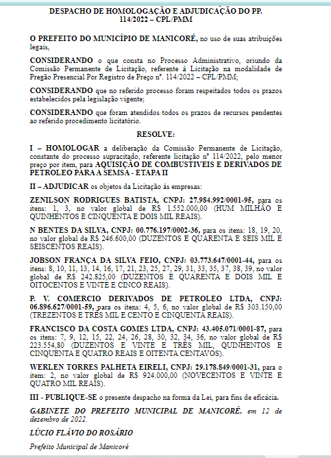 Outras vencedoras foram a A. P. V. Comércio Derivados de Petróleo LTDA, CNPJ: 06.896.627/0001-59, no valor global de R$ 303.150,00 (trezentos e três mil e cento e cinquenta reais) e a Francisco da Costa Gomes LTDA, CNPJ: 43.405.071/0001-87, no valor global de R$ 223.554,80 (duzentos e vinte e três mil, quinhentos e cinquenta e quatro reais e oitenta centavos).