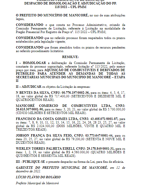 O maior benefício da licitação nº 115/2022, que dispunha R$ 13 milhões para “aquisição de combustíveis e derivados de petróleo” foi para a Manicoré Comercio de combustíveis LTDA, CNPJ: 26.615.307/0001-90, que ganhou o valor R$ 5.700.000,00 (cinco milhões e setecentos mil reais)