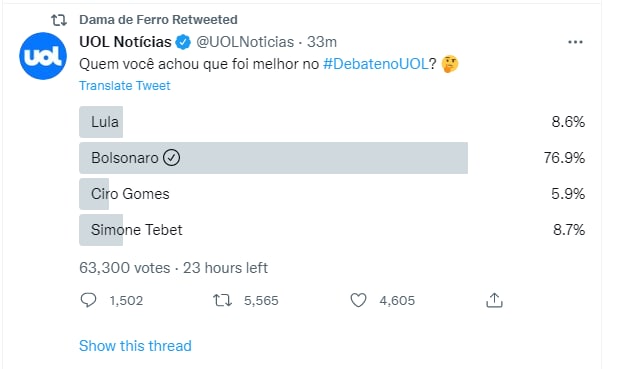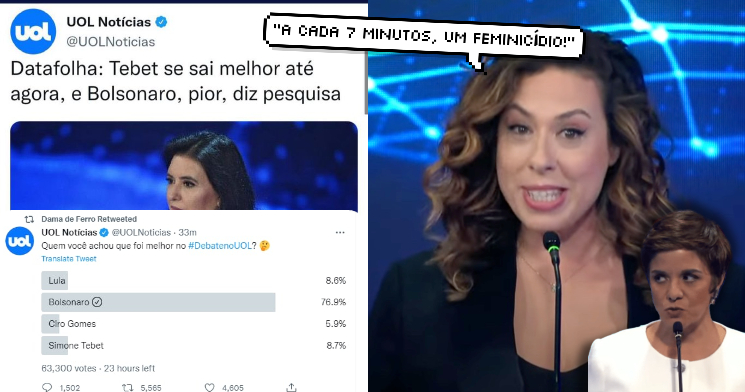 A UOL publicou uma matéria replicando um conteúdo da Folha de SP que alega que a candidata do MDB, Simone Tebet, foi a que melhor se saiu no debate na Bandeirantes, isso baseado na opinião de 64 eleitores indecisos. No entanto, a mesma UOL, ao realizar enquete online, ao qual no momento do print mais de 63 mil pessoas já haviam respondido, fazendo a mesma pergunta ao internautas, mostra que para mais 75% do público, o presidente Jair Bolsonaro foi o grande destaque da noite. Confira: