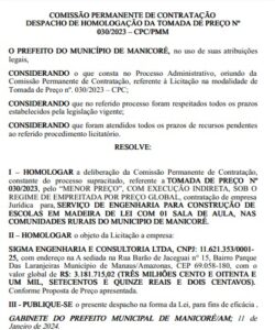 A decisão, referente à tomada de preço Nº 030/2023 – CPC/PMM, revela que a empresa escolhida para a empreitada foi a SIGMA ENGENHARIA E CONSULTORIA LTDA, sediada em Manaus, foi selecionada com base no menor preço, totalizando um montante de R$ 3.181.715,02 a ser pago pelos cofres públicos de Manicoré.