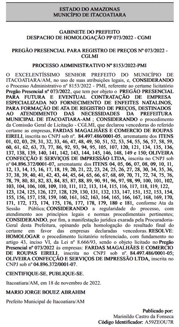 As informações do certame foram divulgada por meio do Despacho de Homologação no dia 18 de novembro, assinada pelo prefeito, e publicado na edição do Diário Oficial dos Municípios do Amazonas na última terça-feira (22), e irá repartir o valor milionário para duas empresas vencedoras da licitação responsáveis pelo fornecimento dos ítens.