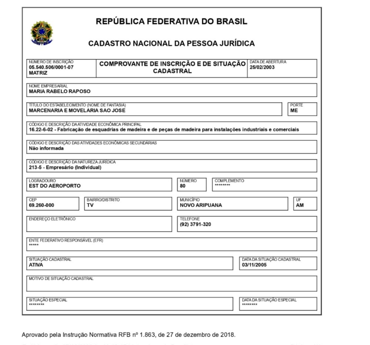 Segundo a transparência da Receita Federal, ela possui com atividade primária atua a fabricação de esquadrias de madeira e de peças de madeira para instalações industriais e comerciais e também está localizada no município de Novo Aripuanã – AM, especificamente, na estrada do aeroporto, n.º 80, bairro: TV. O que chama atenção é que seu quadro de sócios não consta nome de nenhum responsável e nem detalhes sobre o seu capital social.