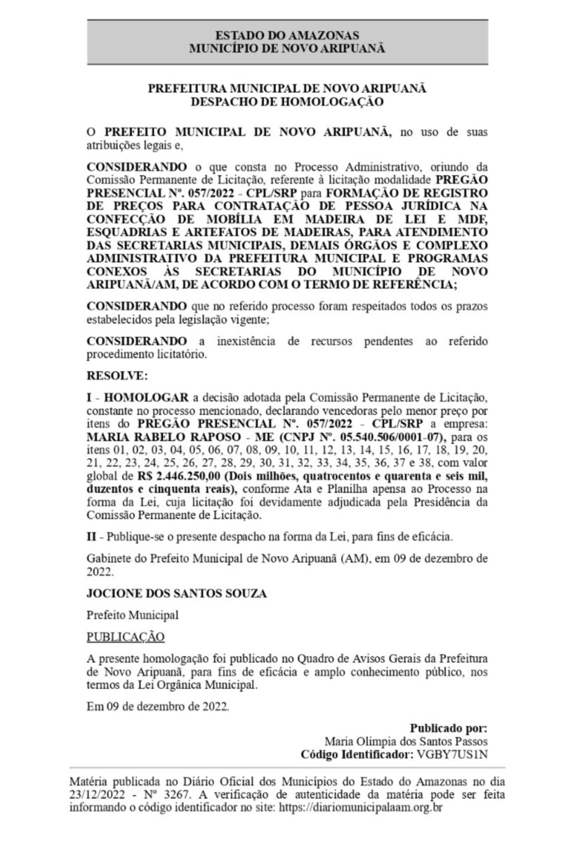 O prefeito também já firmou um contrato com a mesma empresa, com o valor do contrato em R$ 2 milhões. A homologação foi assinada em 18 de outubro e publicada no dia 21 de dezembro de 2021.