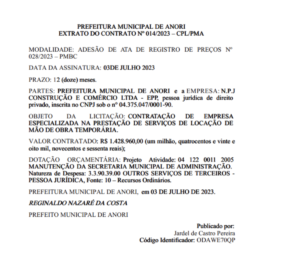 Amazonas – Em recente publicação no Diário Oficial dos Municípios, foi divulgado que o prefeito de Anori, Reginaldo Nazaré, firmou um contrato de locação de mão de obra temporária no valor de mais de R$ 1 milhão de reais.