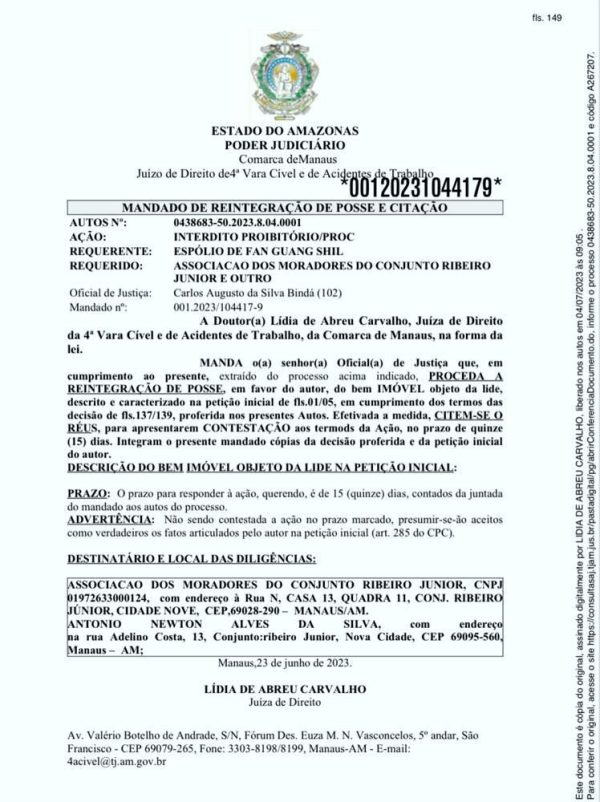 Em resposta às ações da comunidade, a juíza Lídia de Abreu Carvalho expediu um mandado de reintegração de posse em favor da Associação dos Moradores do Conjunto Ribeiro Júnior, na esperança de restaurar o direito de posse legítimo e garantir a segurança da comunidade local.