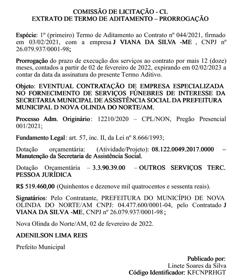 Amazonas – O Prefeito de Nova Olinda do Norte (134 quilômetros de Manaus), Adenilson Reis (MDB), prorrogou um contrato com a empresa J VIANA DA SILVA sob o CNPJ nº 26.079.937/0001-98, conhecida pelo nome fantasia Funerária Emanuel.
