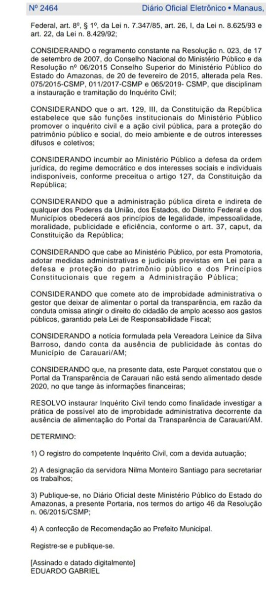 A portaria nº 2022/0000094647 foi publicada no Diário Oficial do MPAM. “Considerando que comete ato de improbidade administrativa o gestor que deixar de alimentar o portal da transparência, em razão dá conduta omissa atingir o direito do cidadão de amplo acesso aos gastos públicos, garantido pela Lei de Responsabilidade Fiscal”, diz trecho da Portaria.