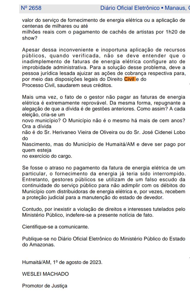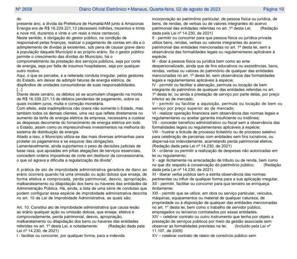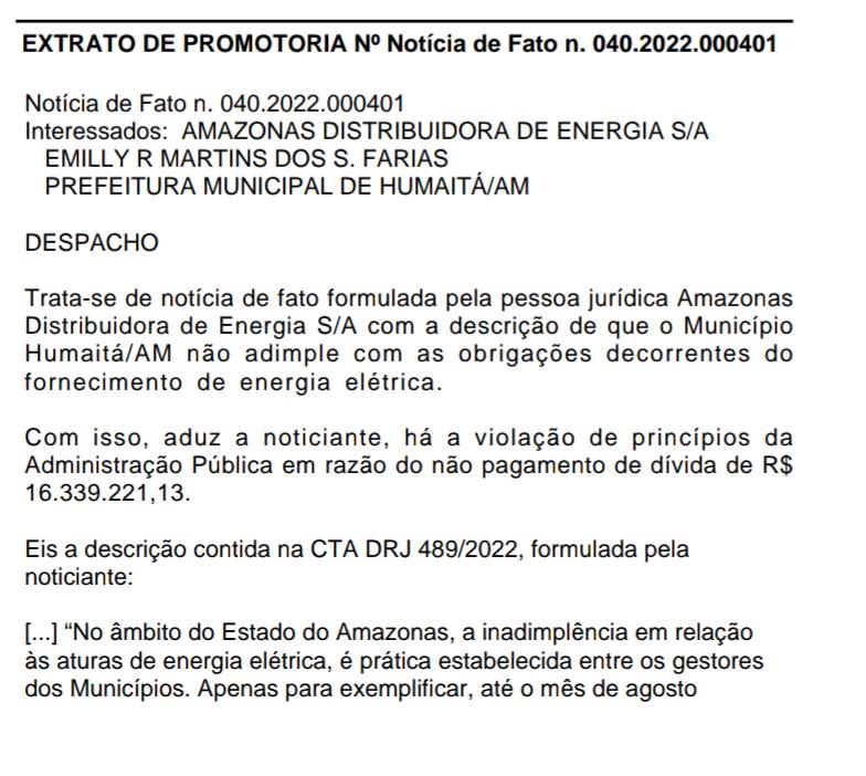 Amazonas – O Ministério Público do Estado do Amazonas (MPAM) acatou uma Notificação de Fato da Amazonas Distribuidora de Energia S/A e notificou a prefeitura de Humaitá, localizada a 701 quilômetros de Manaus, devido ao não pagamento das obrigações do fornecimento de energia elétrica, o que resultou em uma dívida de R$ 16.339.221,13. A situação viola os princípios da administração pública e levanta questionamentos sobre a responsabilidade do débito milionário.