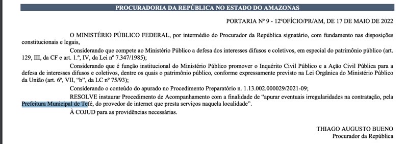 Amazonas – O ministério Público Federal (MPF) abriu investigação na última quarta-feira (18) contra a prefeitura de Tefé por irregularidades na contratação de uma empresa provedora de internet no município localizado a 516 quilômetros de Manaus.