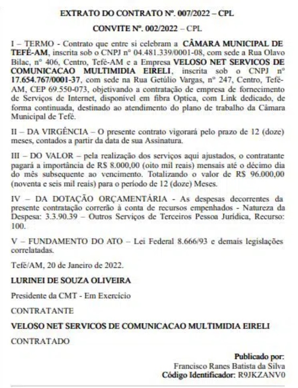 O extrato do contrato foi publicado na última quinta-feira (12), no Diários Oficial dos Municípios (DOM). Conforme o documento, a empresa vai fornecer “serviços de internet, disponível em fibra óptica”. A Câmara pagará pelo serviço, que será prestado por doze meses, o valor mensal de R$ 8 mil.