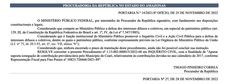 Ainda segundo o documento, a falta de pagamento das contribuições devidas no calendário de 2017 constam em ‘Representação Fiscal para Fins Penais n° 10823.726666/2021-89’. A portaria foi assinada pelo procurador da República, Thiago Pinheiro Correa.