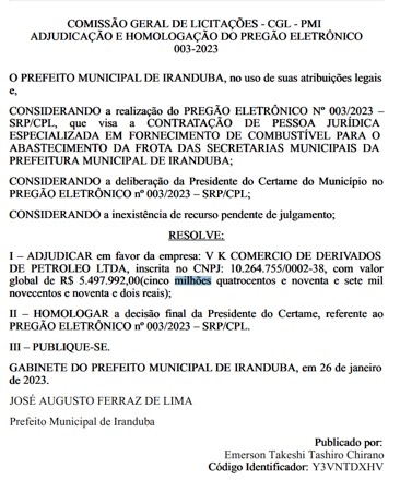 De acordo com o portal da transferência, a prefeitura de Iranduba realizou a contratação da empresa “V K COMERCIO DE DERIVADOS DE PETRÓLEO LTDA”, inscrita no (CNPJ: 10.264.755/0002-38). A prestação de serviços foi firmada no valor de R$ 5.497.992,00 (cinco milhões quatrocentos e noventa e sete mil novecentos e noventa e dois reais) tende abastecer as frotas de veículos das Secretaria Municipais do Iranduba.
