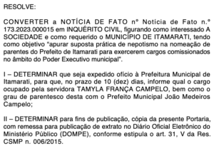 Nepotismo escancarado: MP-AM abre inquérito para apurar nomeações de parentes pelo prefeito de Itamarati