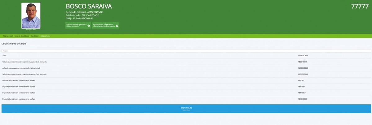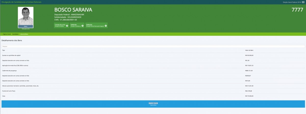 Quando disputou ao cargo de deputado Federal em 2018, Bosco Saraiva havia declarada à Justiça Eleitoral R$605.154,08, em torno de R$ 233 mil reais a mais do que atualmente possui. Ao longo de 4 anos, Bosco alega para a Justiça que empobreceu uma média de R$ 58 mil por ano.