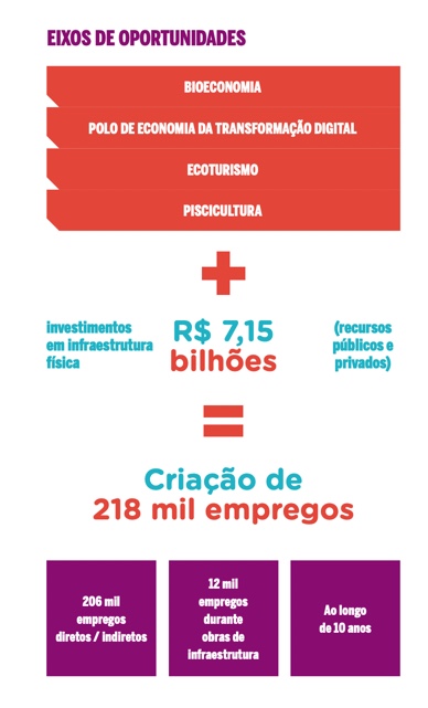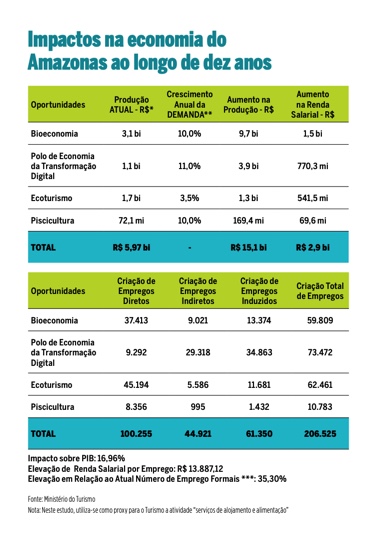 Considerando os outros setores defendidos como prioritários (polo de transformação digital, ecoturismo e piscicultura) no estudo, o impacto no PIB amazonense poderia passar de R$ 2,9 bilhões a R$ 15,51 bilhões. Para isso, seriam necessários R$ 7 bilhões de investimento em infraestrutura física pelos setores público e privado. O valor incluiria um satélite geoestacionário para dinamizar o acesso à banda larga, a ampliação do aeroporto de Manaus e a construção dos polos.