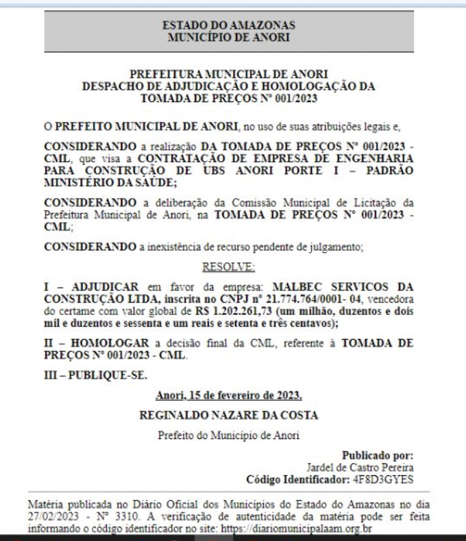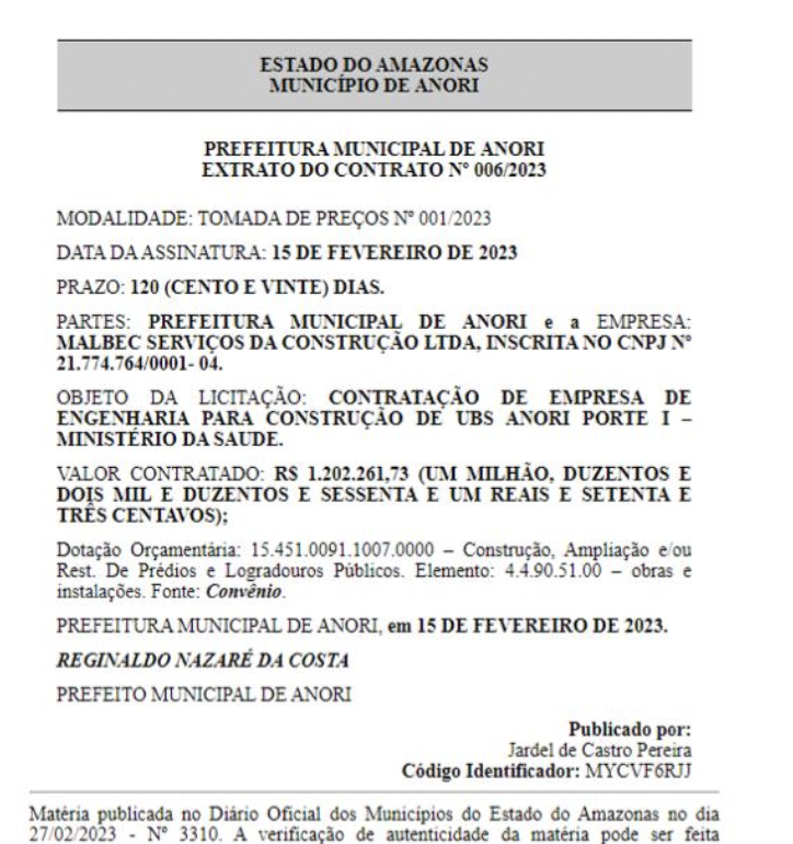 Amazonas – A Prefeitura Municipal de Anori (distante 195 km de Manaus), comandada pelo prefeito Reginaldo Nazaré Costa (Republicanos), publicou no Diário Oficial da Associação Amazonense dos Municípios (AMM), no dia 27 de fevereiro de 2023, a construção de uma Unidade Básica de Saúde (UBS) no valor de R$ 1.202.261,73. O contrato milionário é três vezes maior relacionado ao valor que seria o suficiente para a construção dessa unidade de saúde.