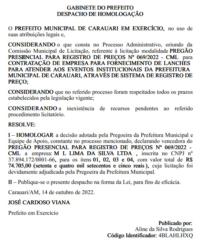 A empresa vencedora da licitação foi a M. L. Lima da Silva LTDA, que tem o nome fantasia de Skina do Lanche, funciona na cidade de Carauari. O valor total do contrato é de exatamente R$ 74.705,00 (setenta e quatro mil, setecentos e cinco reais), para fornecimento de salgadinhos.