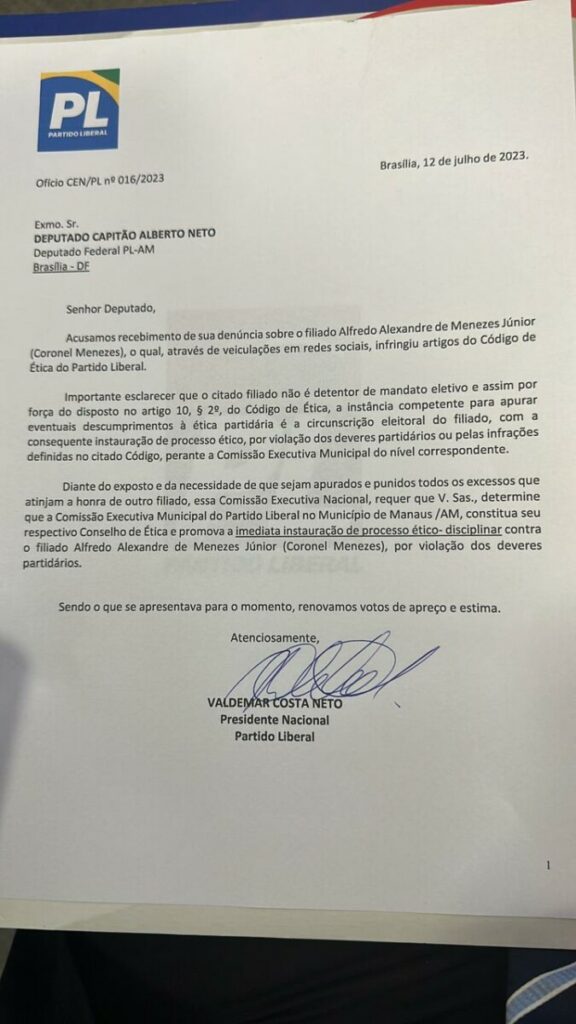 A instrução para que o diretório do PL em Manaus tome providências contra Menezes ocorreu menos de 24 horas após o mesmo ter proferido insultos contra o deputado federal Capitão Alberto Neto, que é membro do partido. A intenção do coronel reservista foi rotular o parlamentar como traidor e “sem palavra”, visto que Menezes almeja disputar a prefeitura de Manaus em 2024.