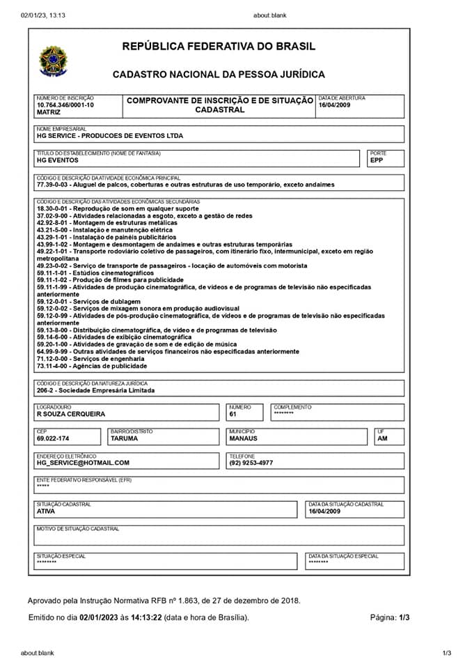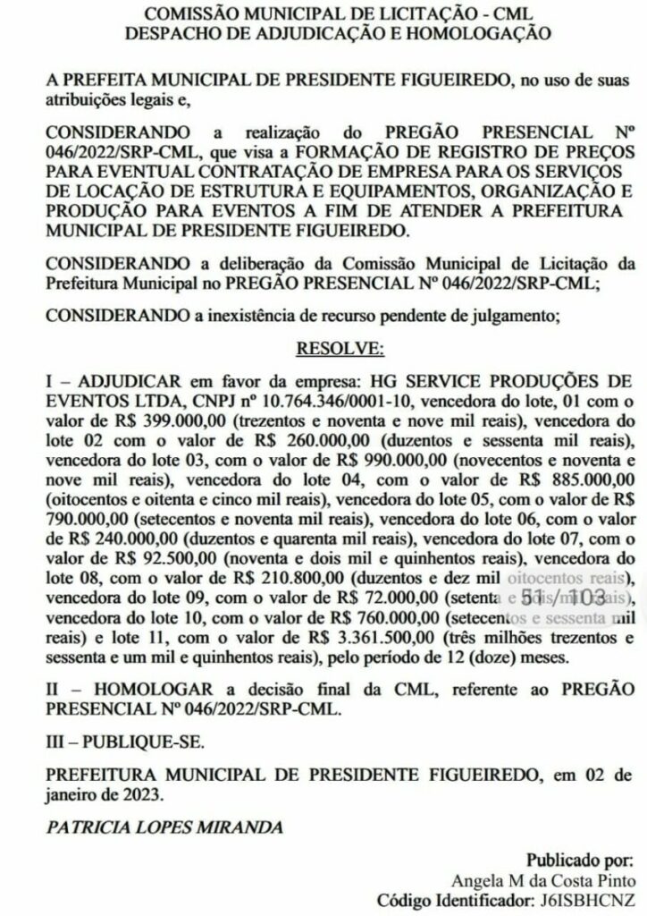 Segundo o documento, a empresa agraciada com a ‘bolada’ é a HG Service Produções de Eventos Ltda (CNPJ: 10.764.346/0001-10), e de nome fantasia HG Eventos. A empresa atua no ramo de aluguel de palcos, coberturas e outras estruturas de uso temporário, exceto andaimes. Localizada na rua Souza Cerqueira n.º61, bairro Tarumã, Manaus/Amazonas. E também tem como sócios responsáveis Marcos Antônio Ferreira Costa e Laina da Silva e Silva.