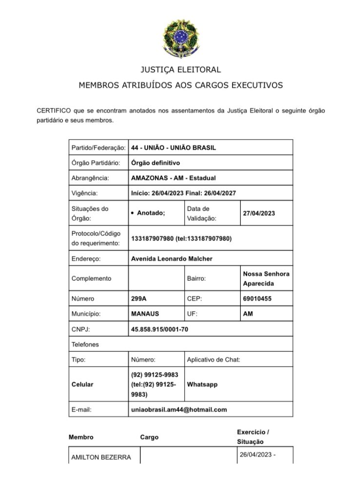 Entre os nomes que compõe o novo diretório do União Brasil até 2027, podem ser destacados o prefeito de Parintins, Bi Garcia e o prefeito de Eirunepé Raylan Barroso, ambos apoiadores do senador Eduardo Braga (MDB), na campanha para o governo em 2022.