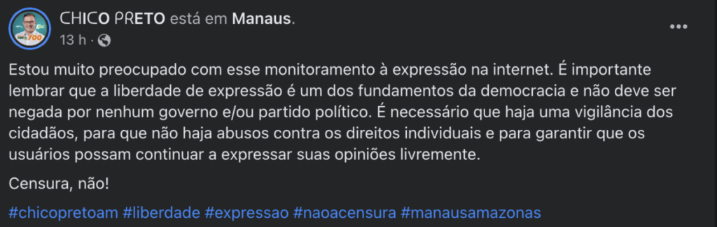 Nas redes sociais internautas já reagem contra a medida, mostrando preocupação quanto a liberdade de expressão. O ex-vereador Chico Preto publicou “estou muito preocupado com esse monitoramento à expressão na internet. É importante lembrar que a liberdade de expressão é um dos fundamentos da democracia e não deve ser negada por nenhum governo e/ou partido político”.