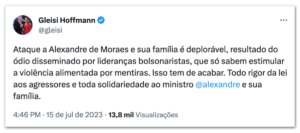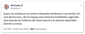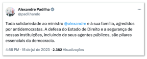 O ministro das Relações Institucionais, Alexandre Padilha, prestou solidariedade a Alexandre de Moraes e sua família, ressaltando que a defesa do Estado de Direito e a segurança das instituições são pilares fundamentais da democracia.