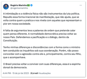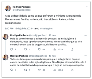 O presidente do Senado, Rodrigo Pacheco, do Partido Social Democrático (PSD), utilizou sua conta no Twitter para expressar sua indignação diante dos atos, classificando-os como “inaceitáveis”. Pacheco ressaltou a importância de que todos os lados colaborem para manter o antagonismo no campo das ideias e das ações legítimas.