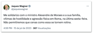 Outro ministro que se manifestou sobre o episódio foi Rui Costa, da Casa Civil, que afirmou que “em uma democracia, não há espaço para tamanha hostilidade e agressão”. Ele enfatizou a necessidade de que os responsáveis pelo ato de violência sejam responsabilizados perante a Justiça.
