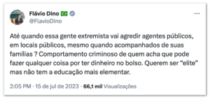O ministro da Justiça, Flávio Dino, foi um dos primeiros a se manifestar sobre o caso, qualificando os autores da hostilização como “extremistas”. Dino ressaltou a importância de preservar o Estado de Direito e a segurança das instituições democráticas, incluindo seus agentes públicos.