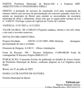 Prefeita de Beruri prorroga contrato de R$ 15 milhões com empresa de pavimentação; veja documento