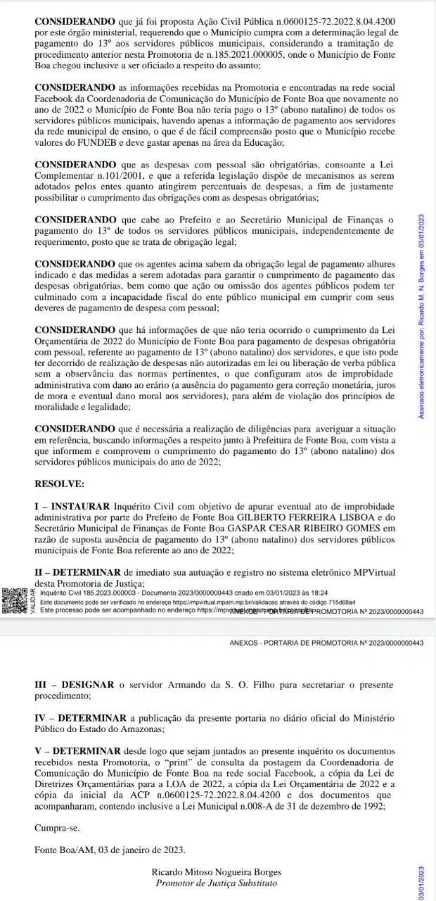 O Ministério Público do Amazonas abriu um inquérito civil contra o prefeito de Fonte Boa, Gilberto Ferreira Lisboa, e o secretário municipal de finanças por não terem pago o 13° salário aos servidores da cidade em 2022. A investigação visa apurar possíveis atos de improbidade administrativa, que podem ter causado a incapacidade fiscal do município em cumprir com suas obrigações. De acordo com o MP, a prefeitura já havia sido notificada anteriormente para que cumprisse a Lei Municipal n° 008-A, de dezembro de 1992, e realizasse o pagamento, mas o pedido não foi atendido.