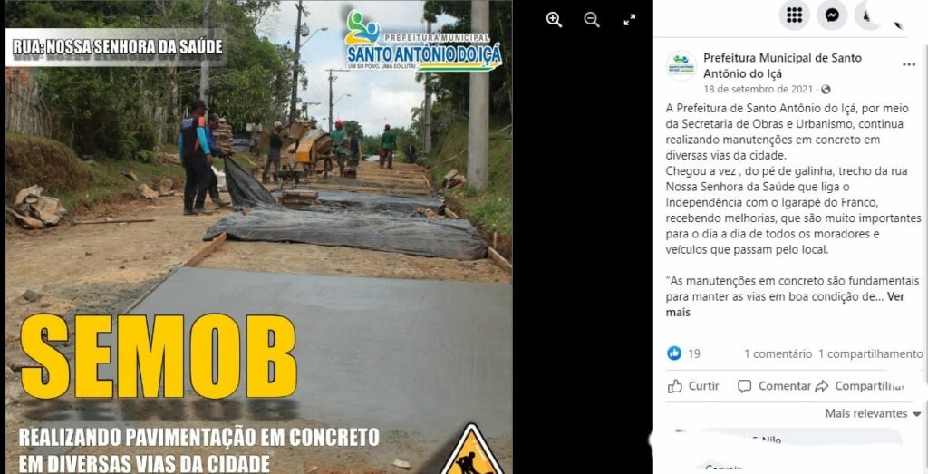 Segundo publicações nas redes sociais da prefeitura de Santo Antônio do Iça, várias ruas foram pavimentadas ao longo do mês de setembro de 2021. Entre elas, as ruas Nossa Senhora da Saúde, Avenida Duque de Caxias, Avenida Jacob Acris e rua João Dárcio.