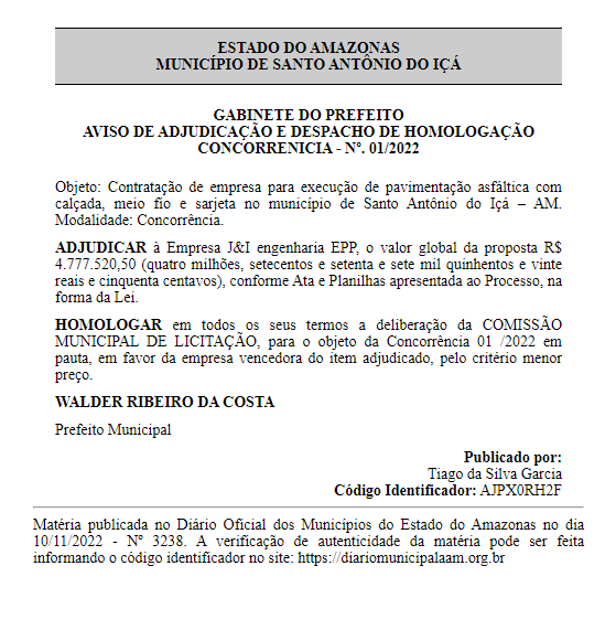 Além disso, a Prefeitura de Santo Antônio do Iça não divulgou informações detalhadas no contrato, que teria foi firmado em novembro deste ano. Por exemplo, o documento não detalha prazos de obras ou locais que serão realizados os serviços de recapeamento. De acordo com o documento publicado no Diário Oficial dos Municípios do Estado do Amazonas, na última quinta-feira (10), a empresa vai receber pelo “serviço” o valor global da proposta R$ 4.777.520,50 (quatro milhões, setecentos e setenta e sete mil quinhentos e vinte reais e cinquenta centavos).
