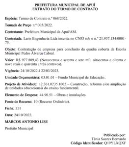 Amazonas – O prefeito de Apuí (1.196 quilômetros de Manaus0, Marcos Antônio Lise (PSC), vai gastar dos cofres públicos, o valor de R$ 977.889,43 (Novecentos e setenta e sete mil, oitocentos e oitenta e nove reais e quarenta e três centavos), para concluir a reforma da quadra coberta da Escola Municipal Pedro Álvares Cabral, no município.