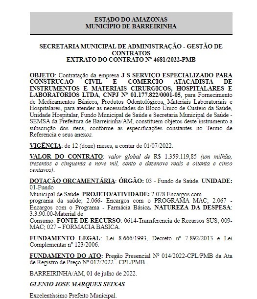 Amazonas – O prefeito do município de Barreirinha, Glenio José Marques Seixas (MDB), vai gastar mais de R$ 1.350 milhões com a contratação de empresa para fornecer medicamentos básicos, produtos odontológicos, materiais laboratoriais e hospitalares, para atender as necessidades do Bloco Único de Custeio da Saúde, Unidade Hospitalar, Fundo Municipal de Saúde e Secretaria Municipal de Saúde – SEMSA da Prefeitura do Município.