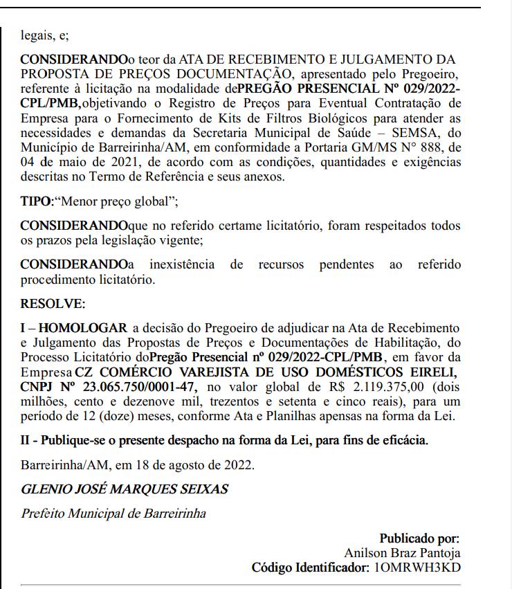 Amazonas – O prefeito de Barreirinha, Glênio Seixas (MDB), vai gastar mais de R$ 2,1 milhões do dinheiro público em “filtros biológicos”. O extrato de despacho de homologação do presencial nº 029/2022 foi assinado e publicado no Diário Oficial dos municípios do Amazonas.