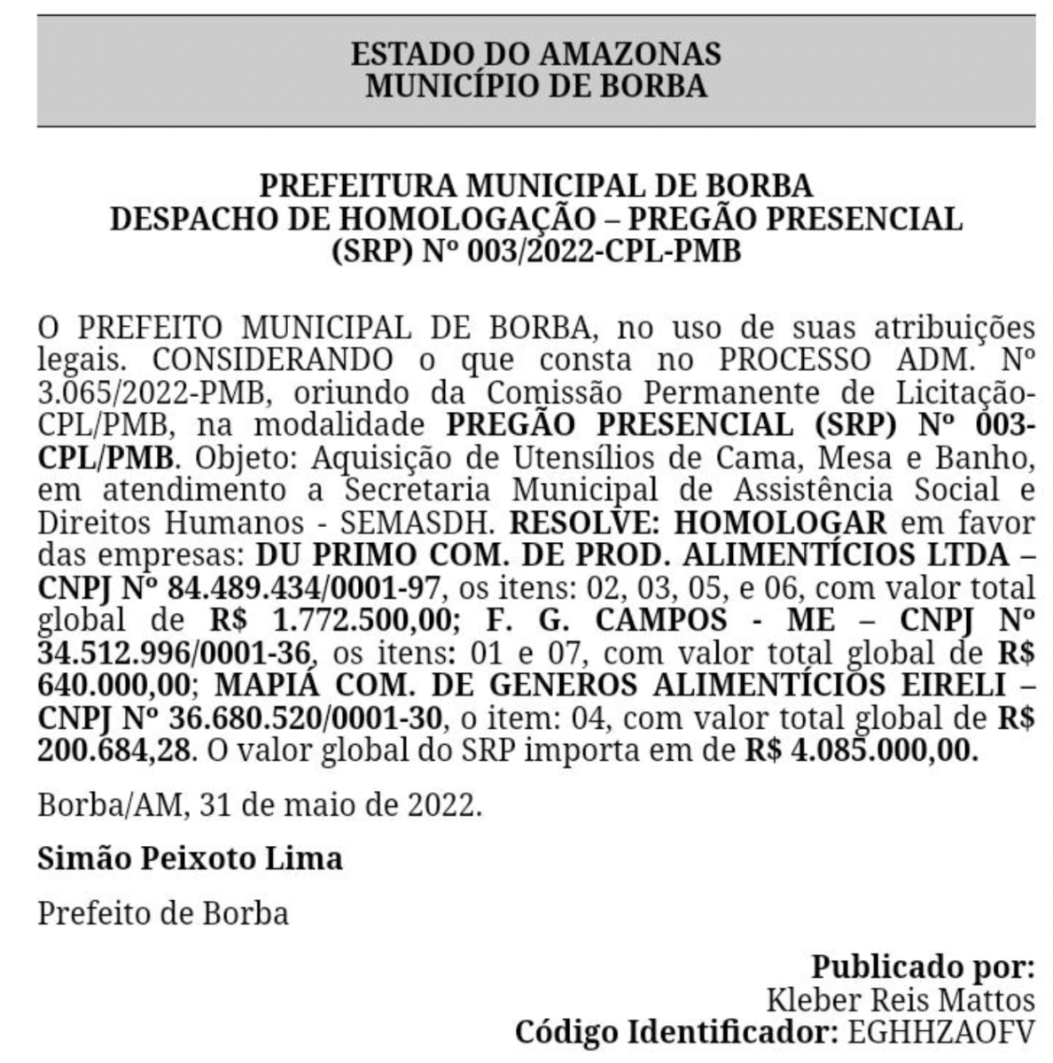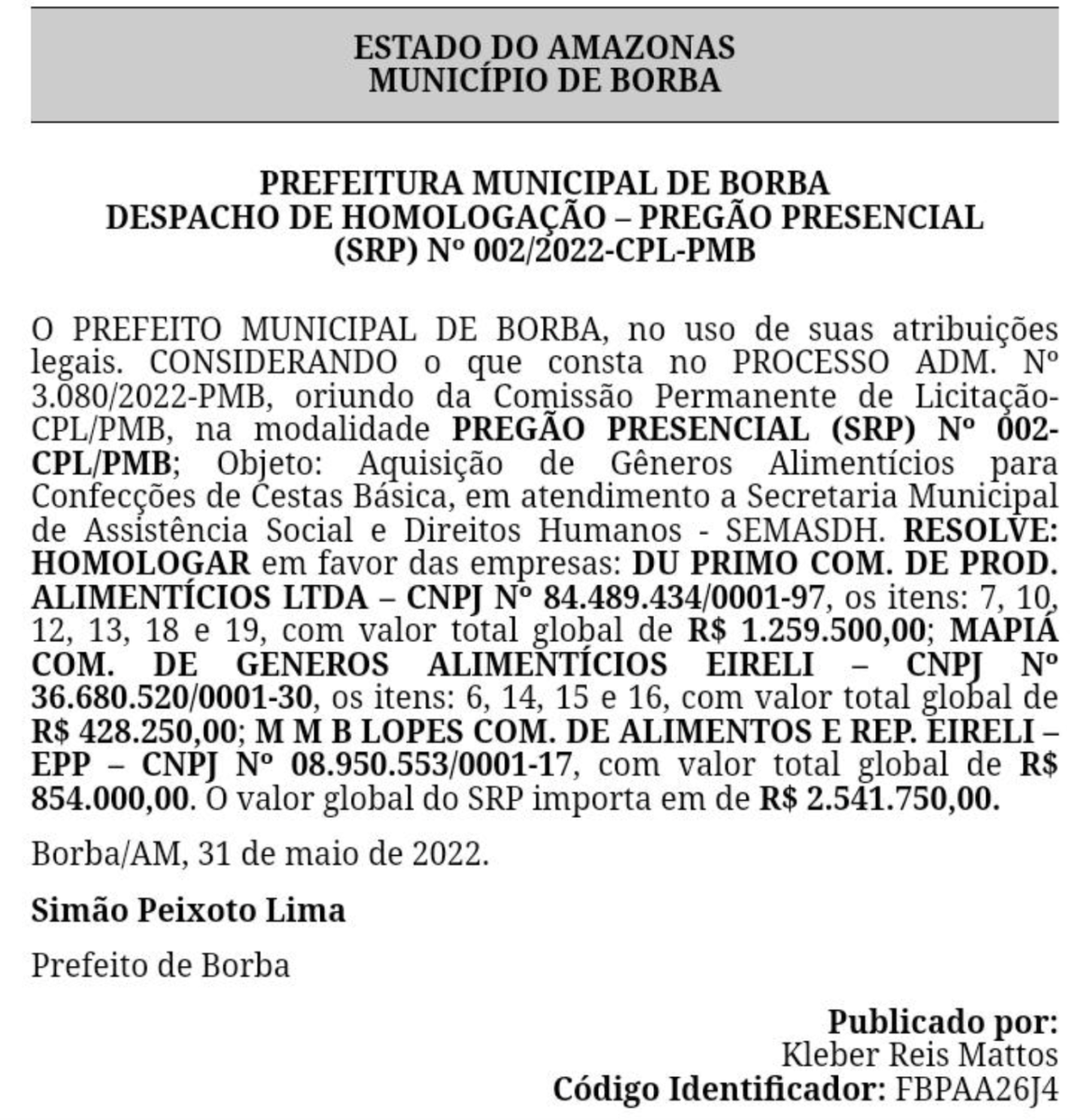 As licitações foram assinadas pelo gestor municipal e foi publicada na edição do Diário Oficial dos Municípios do Amazonas. Da soma de R$ 7.440.145,60, pregão presencial nº 002/2022 prevê o pagamento de R$ 2.542.750,00 para itens de cestas básicas.