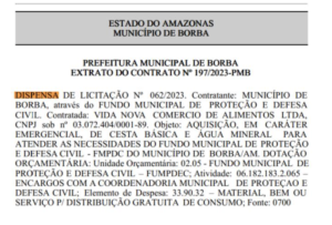 A transação, detalhada no Extrato do Contrato n° 197/2023-PMB, com Dispensa de Licitação n° 062/2023, tem como objetivo a compra de cestas básicas e água mineral para suprir as demandas do Fundo Municipal de Proteção e Defesa Civil.