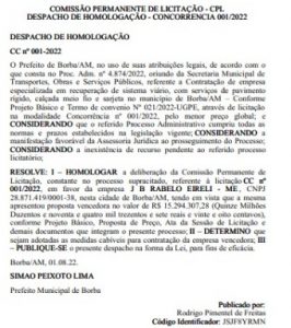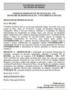 Amazonas – Em consulta ao Diário Oficial dos Municípios do Estado do Amazonas (DOM-AM), o Portal e TV CM7 Brasil, constatou que o prefeito de Borba, Simão Peixoto Lima (Progressistas), vai pagar mais de R$ 15 milhões para a empresa J B Rabelo Eireli – ME, realizar serviços de recuperação no sistema viário e reforma das vias públicas.