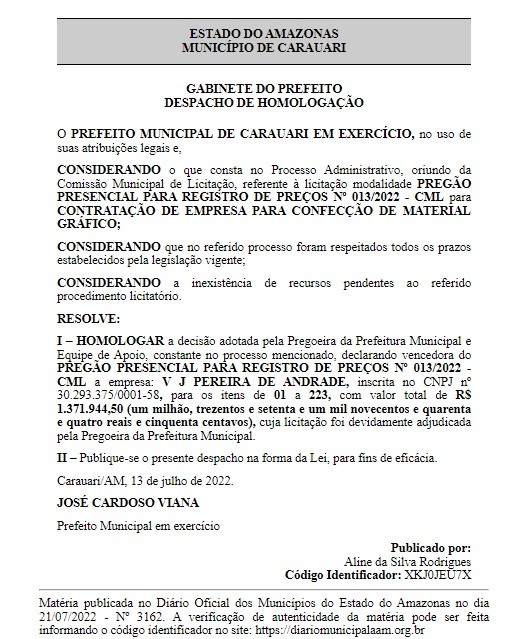 Segundo a publicação do Diário Oficial dos Municípios do Estado do Amazonas (DOM-AM), desta quinta-feira (21). O contrato foi assinado no dia 13 de julho de 2022.