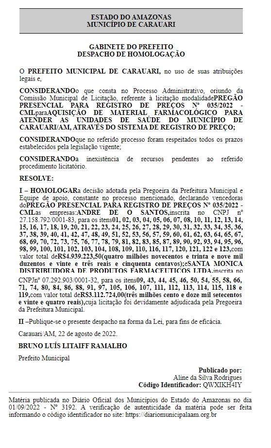 Segundo a publicação, as empresas vencedoras do processo licitatório milionários, são a Santa Mônica Distribuidora de Produtos Farmacêuticos Ltda, mais conhecida como Distribuidora Santa Mônica, localizada no bairro Parque Dez de Novembro, em Manaus, e a André de O. Santos, conhecida como Drogaria Bom Jesus, de Carauari.