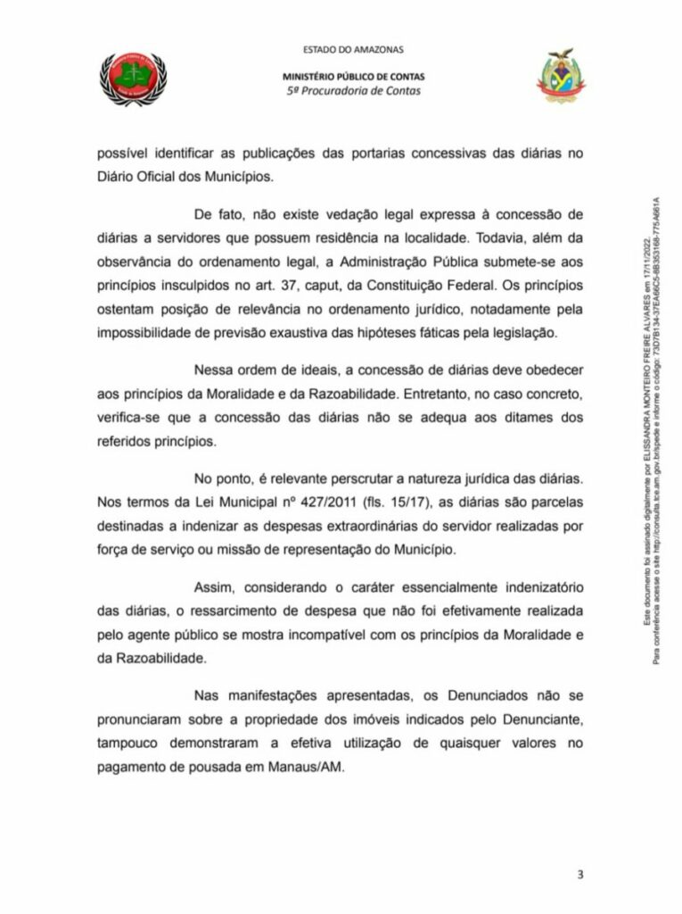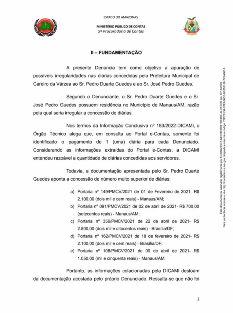 Segundo denúncia feita pelo Ministério Público de Contas (MPC-AM), José Guedes, filho do prefeito, e o secretário de finanças do município, utilizam de forma ilegal os recursos de diárias pagas pela prefeitura nos momentos em que vão a Manaus, mesmo possuindo moradia na capital.